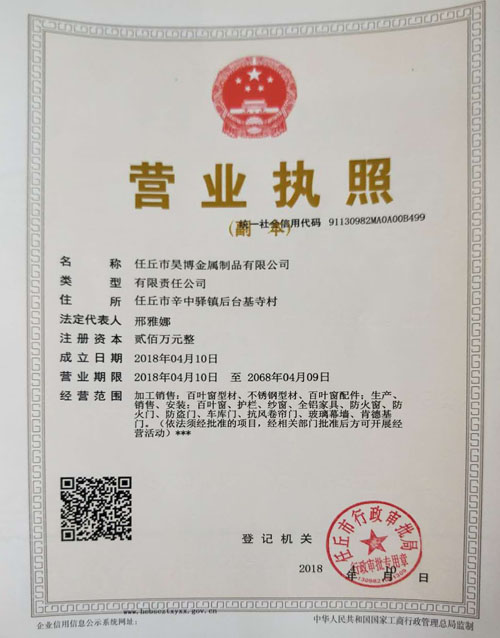 证书介绍 加工销售:百叶窗型材、不锈钢型材、百叶窗配件;生产、销售、安装:百叶窗、护栏、纱窗、全铝家具、防火窗、防火门、防盗门、车库门、抗风卷帘门、玻璃幕墙、肯德基门。(依法须经批准的项目,经相关部门批准后方可开展经营活动)***